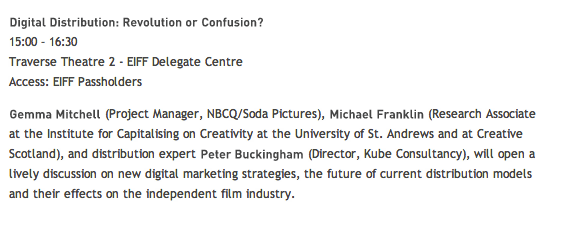 EIFF Digital Distribution Panel Posted on July 15, 2012 It was fun to do an industry panel on digital distribution with Pete Buckingham and Gemma Mitchell of NBCQ at Soda, details of discussion to follow. Share this: Click to share on X (Opens in new window) X Click to share on Facebook (Opens in new window) Facebook Like Loading... Related