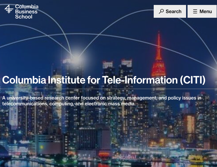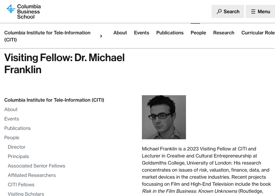 I am delighted to be a Visiting Fellow at CITI, Columbia Business School, Columbia University where I am working on risk, valuation, finance, data, and market devices in film and HETV.